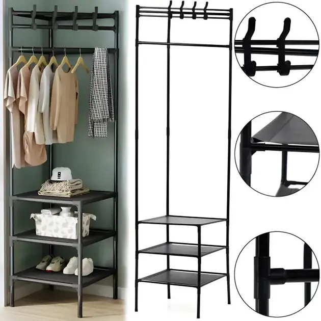 кутова підлогова вішалка-стелаж (Corner rack). Це багатофункціональне рішення для зберігання одягу та аксесуарів, яке допомагає ефективно використовувати кутовий простір у прихожій, спальні або гардеробній.